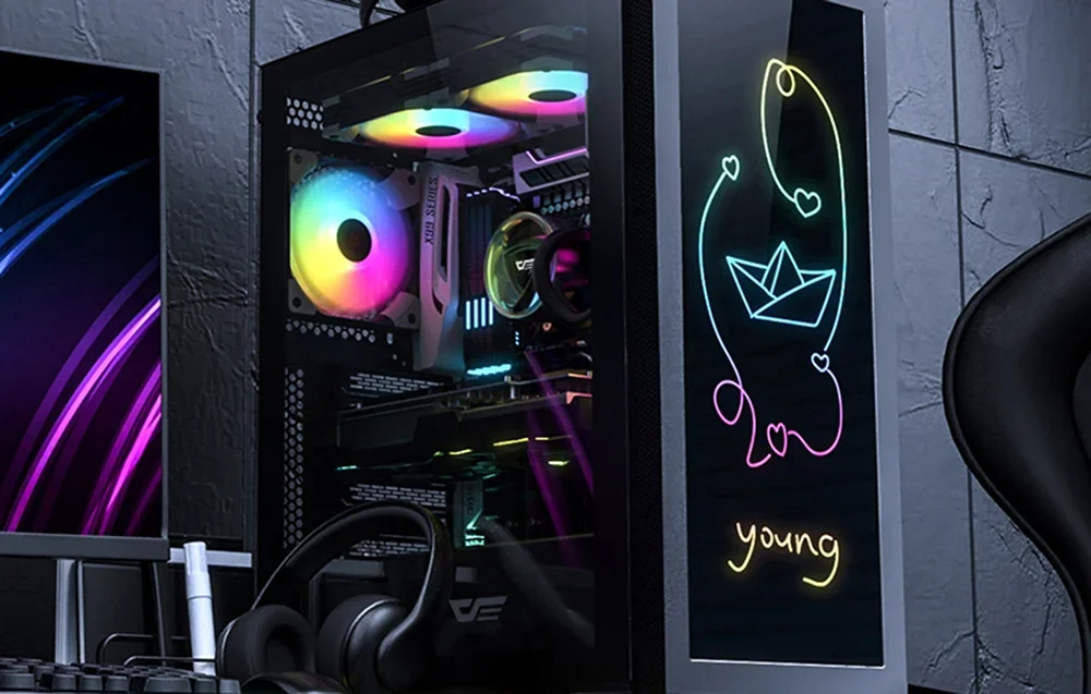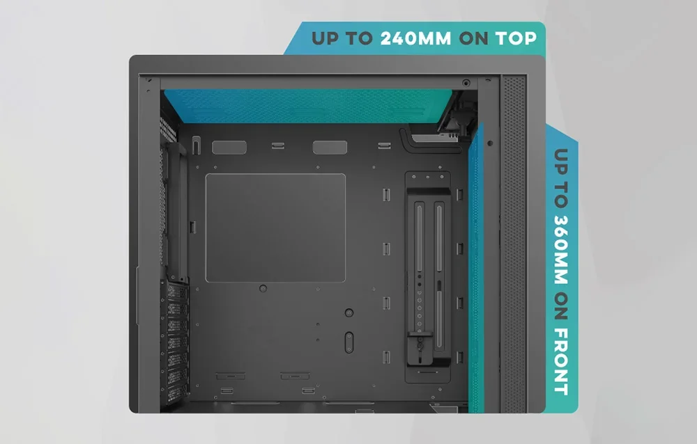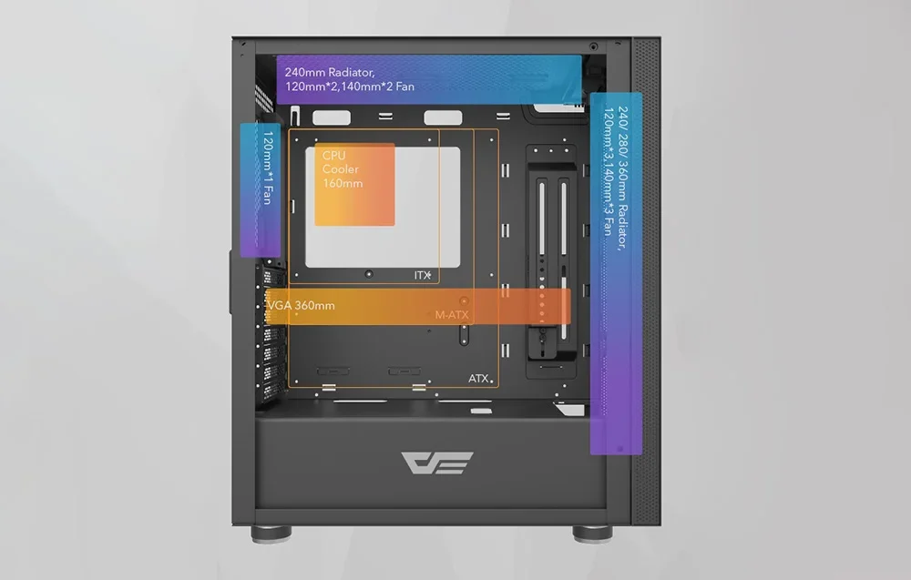 Piešķiriet savam datora korpusam personīgu raksturu! Pateicoties unikālajam priekšējam panelim, varat dekorēt korpusu ar paša izveidotu zīmējumu vai uzrakstu, kas ne tikai atbildīs jūsu stilam, bet arī mainīs krāsu, pateicoties ARGB apgaismojuma saderībai. DK210 var aprīkot ar papildu dzesēšanu. Priekšpusē varat uzstādīt 360 mm dzesēšanu, augšpusē 240 mm un aizmugurē 120 mm. Tas ne tikai uzsvērs spēļu korpusa izskatu, bet arī nodrošinās vislabāko jūsu komponentu dzesēšanu. Augšējā panelī viegli pieejami USB 3.0, USB 2.0 un HD audio savienojumi.