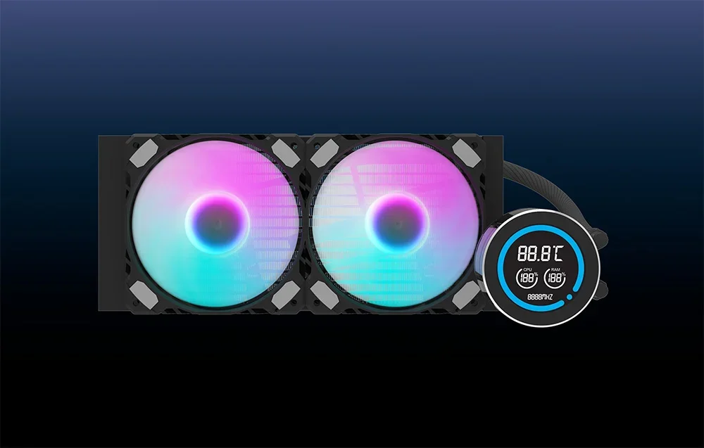 Darkflash DN-D240 ir augstas veiktspējas 240 mm ūdens dzesētājs, kas nodrošina stabilu procesora darbību zemā temperatūrā. Tam ir vara ūdens bloks un alumīnija radiators, kas efektīvi izkliedē siltumu, kas ir būtiski pie lielas sistēmas slodzes. Divi 120 mm ventilatori ar hidrauliskiem gultņiem, PWM vadību un ARGB apgaismojumu garantē optimālu gaisa plūsmu un klusu darbību. LCD ekrāns ļauj uzraudzīt procesora un RAM temperatūras, bet IIR+EPDM caurules nodrošina augstu izturību pret temperatūru un ilgmūžību.