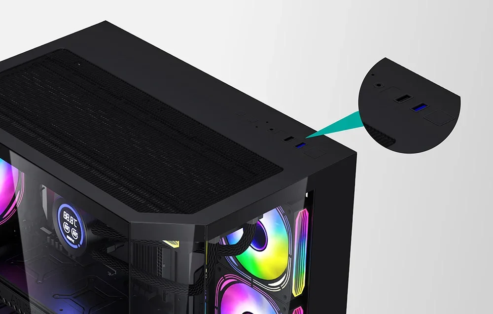 FT350 ļauj izveidot paplašinātu siltuma izkliedes sistēmu – tajā ietilps līdz 7 ventilatoriem. Varat arī uzstādīt 240 mm ūdens dzesēšanu. Tas viss ļaus brīvi spēlēt dinamiskas spēles vai veidot sarežģītus grafikas projektus – neuztraucoties, ka dators pārkarsis! Turklāt komplektā atradīsiet piecus jaudīgus ARGB ventilatorus, kas izceļas ne tikai ar augstu efektivitāti, bet arī ar modernu, stilīgu dizainu.