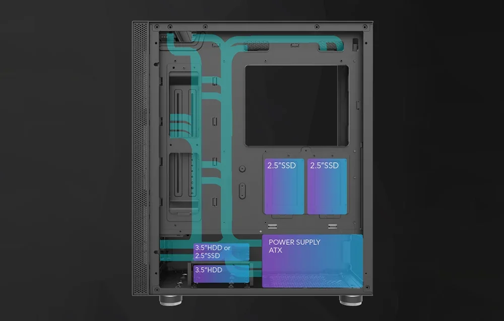 Vienkāršu komponentu uzstādīšanu un pienācīgas kārtības uzturēšanu korpusa iekšienē nodrošina atbilstošs korpusa dizains. Ar speciāliem kronšteiniem var uzstādīt HDD un SSD diskus tieši korpusā, bez papildu sliedēm, un daudzās atveres, kas izvietotas piemērotākajās vietās, ļaus sakārtot komponentu kabeļus.