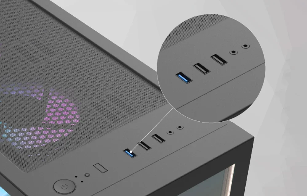 Augšpusē atradīsiet datora ieslēgšanas/izslēgšanas slēdzi, kā arī USB 3.0, USB 2.0 un HD audio portus. Tas atvieglos piekļuvi jebkuras portatīvās atmiņas saturam un ļaus pievienot spēļu austiņas, neatkarīgi no tā, vai tām ir USB vai Minijack savienojums. Ar LED pogu varat arī kontrolēt RGB apgaismojuma krāsu un tipu korpusa iekšienē.