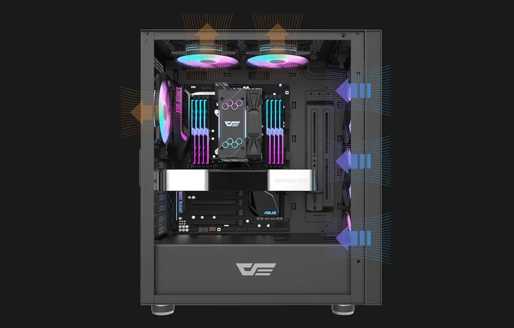 Piešķiriet savam datora korpusam personīgu raksturu! Pateicoties unikālajam priekšējam panelim, varat dekorēt korpusu ar paša izveidotu zīmējumu vai uzrakstu, kas ne tikai atbildīs jūsu stilam, bet arī mainīs krāsu, pateicoties ARGB apgaismojuma saderībai. DK210 var aprīkot ar papildu dzesēšanu. Priekšpusē varat uzstādīt 360 mm dzesēšanu, augšpusē 240 mm un aizmugurē 120 mm. Tas ne tikai uzsvērs spēļu korpusa izskatu, bet arī nodrošinās vislabāko jūsu komponentu dzesēšanu. Augšējā panelī viegli pieejami USB 3.0, USB 2.0 un HD audio savienojumi.